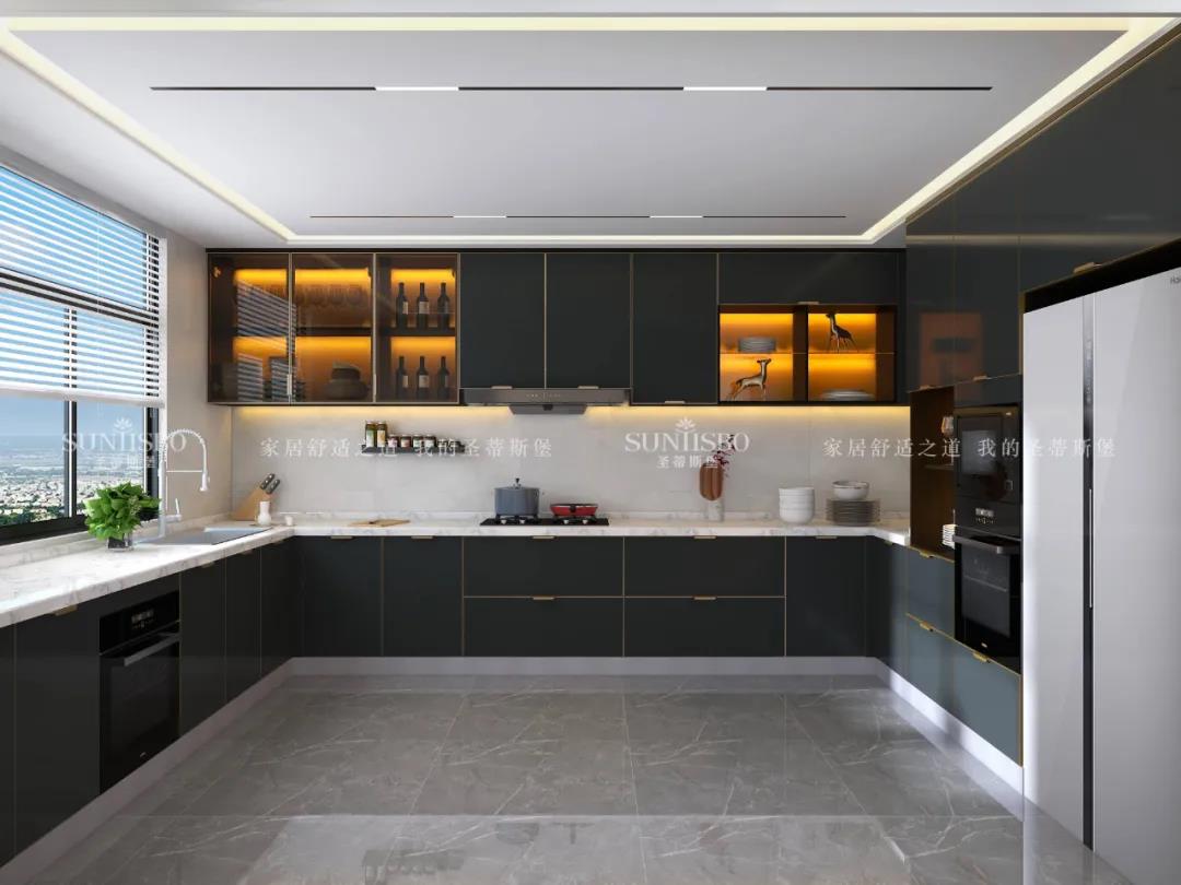 視覺色彩是激活感官的情緒支點,以色彩為重心的櫥柜系統,喚醒了簡奢廚房的關鍵所在。亮色金屬與深色實木柜體形成撞色櫥柜,極具空間爆發(fā)力。在深色柜體包裹中展現金屬、玻璃、實木的高級質感,剛毅線條交錯延續(xù),一秒就點燃了時尚潮流的生活態(tài)度。