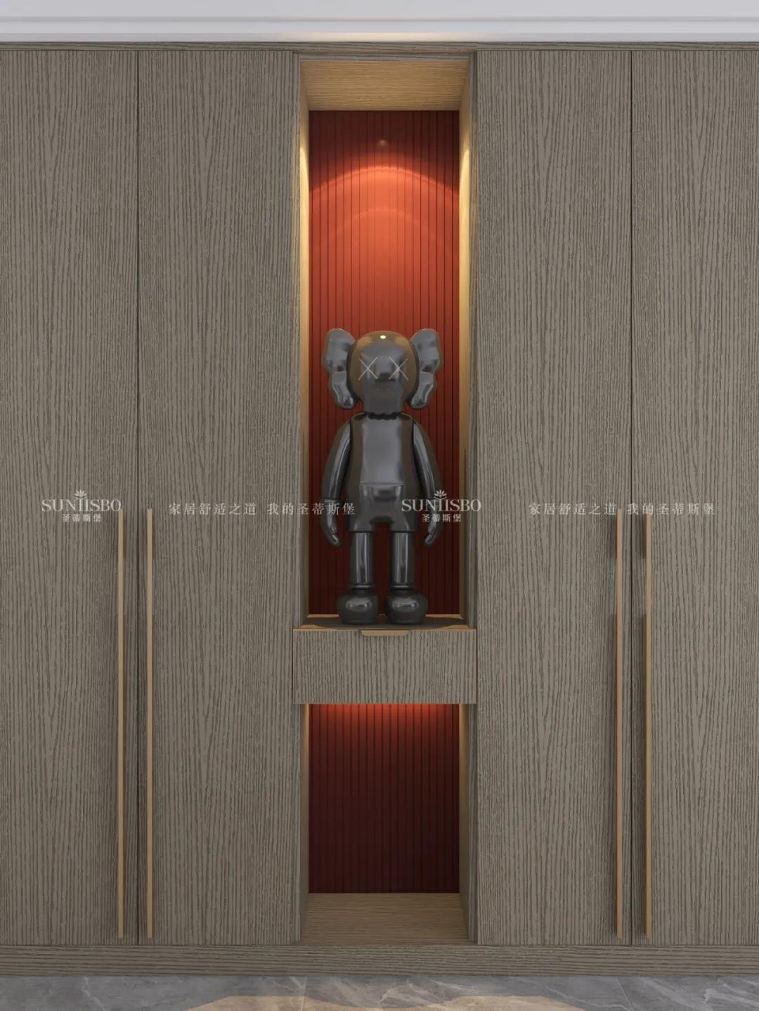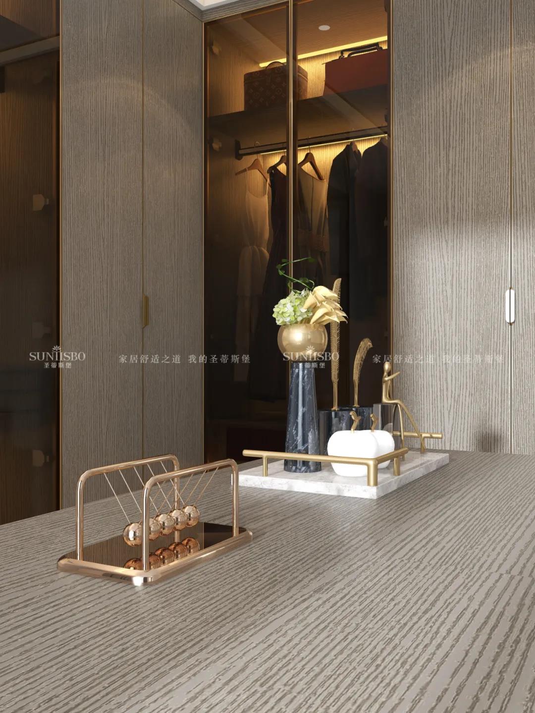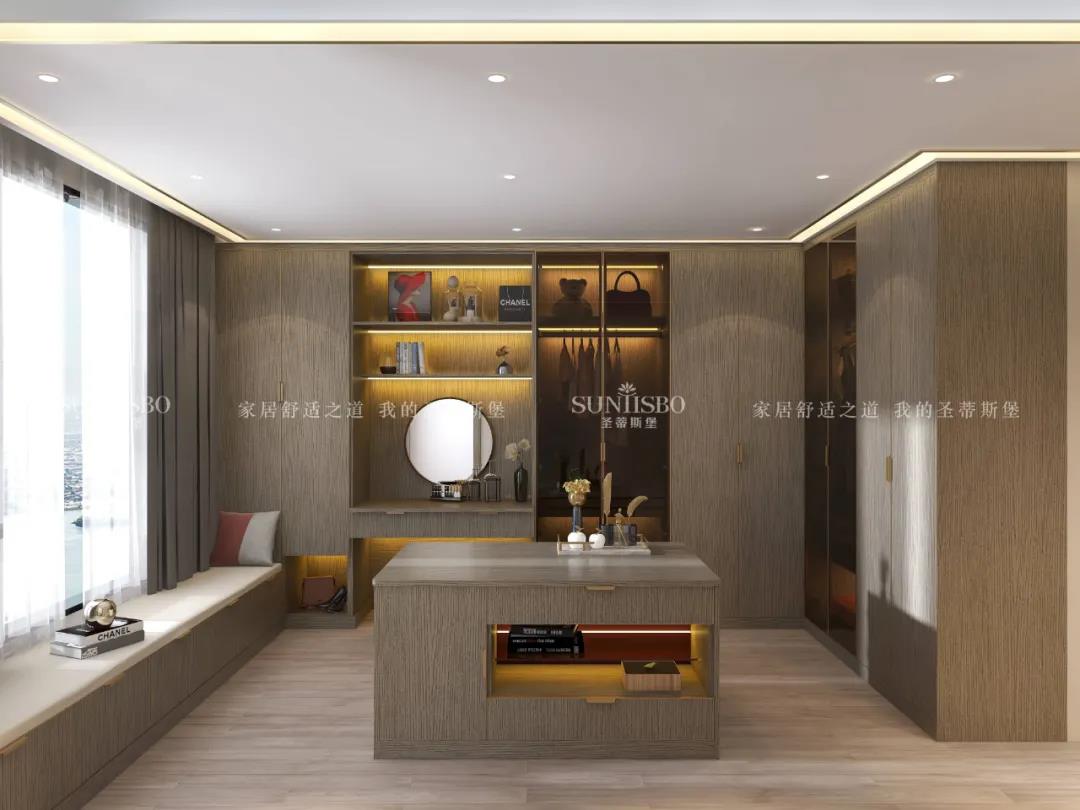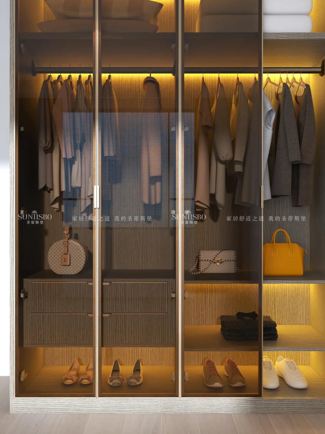 衣柜采用一體化的定制形式,木紋配合開放式玻璃柜門,從懸掛區(qū)收納、抽屜收納到鞋子收納等,均滿足超大收納系統,讓每一件衣物都有自己的歸宿,更為愛美的你量身打造可觀賞的儲物空間。