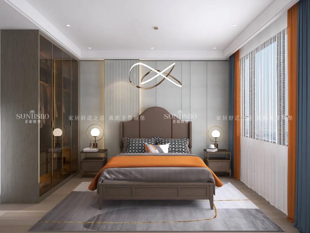 簡明而干凈的流線背景墻,猶如瀑布一瀉千里。床屏顏色的選擇以素雅的駝色和溫潤的木色呈現質感,精巧別致的燈具與背景墻光影,透視出空間動靜之間的歡快。每一縷陽光灑落,都緊緊包裹著未曾安放的靈魂。