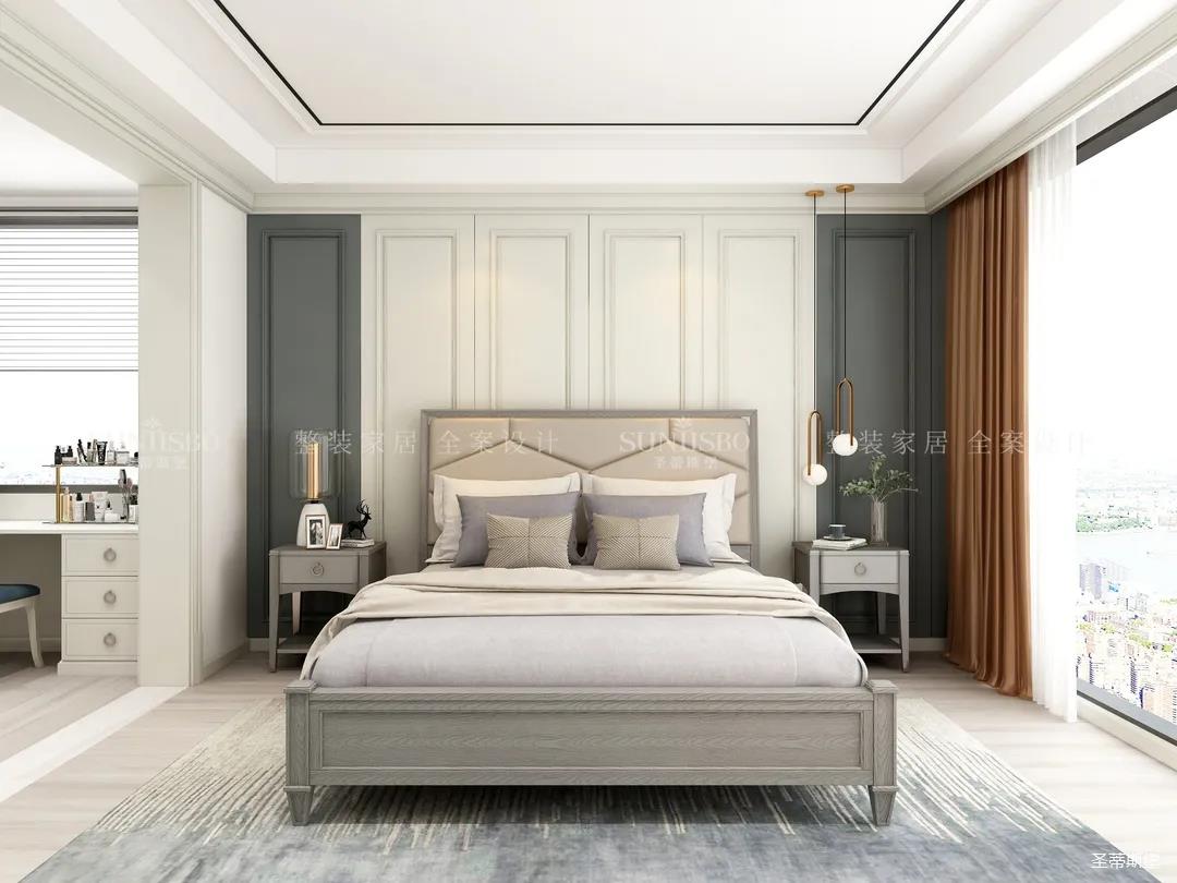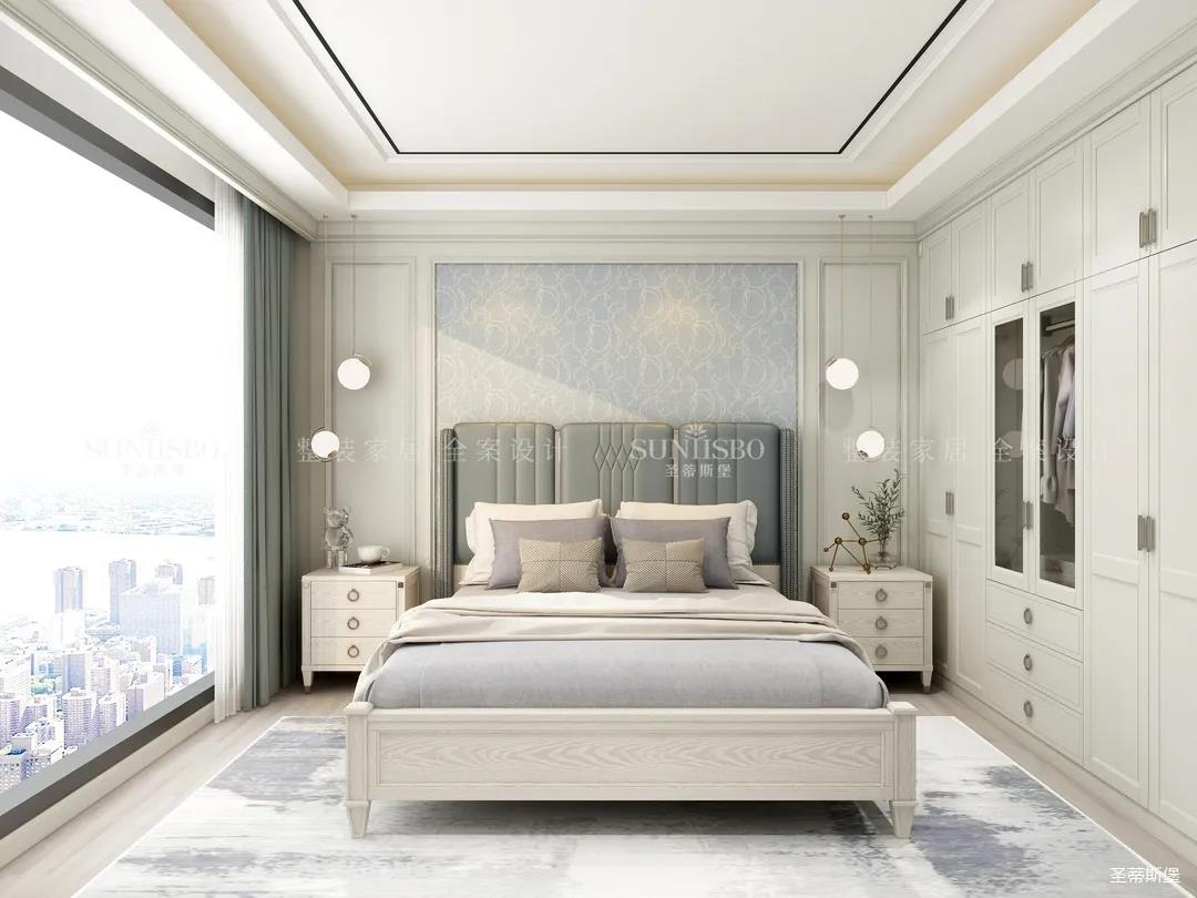 輕盈而明亮的實木飾面與超大落地窗,給次臥空間帶來了明朗的空間視野,莫蘭迪色彩交疊出最時尚的空間底色。定制衣柜對稱開合讓空間秩序規(guī)律又齊整,護墻選擇了淺藍色打底,雖是美式風(fēng)格,顏色卻沒有美式的厚重感,印花貼合著床屏,流線簡練利落,以簡致的維度詮釋著美式雅致的舒適生活。
