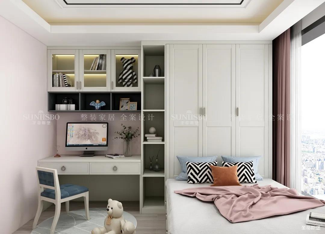 考慮到兒童身體免疫系統(tǒng)尚未成熟,抵抗力相對會較弱,所以空間采用了E0級全實木打造,少女粉墻體與仿古白柜體對應(yīng)搭配出兒童空間的平衡點,典型的榻榻米+書桌的設(shè)計,既保證了足夠的學(xué)習(xí)區(qū),還兼顧著收納功能。