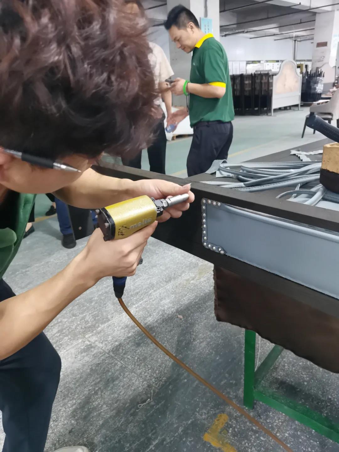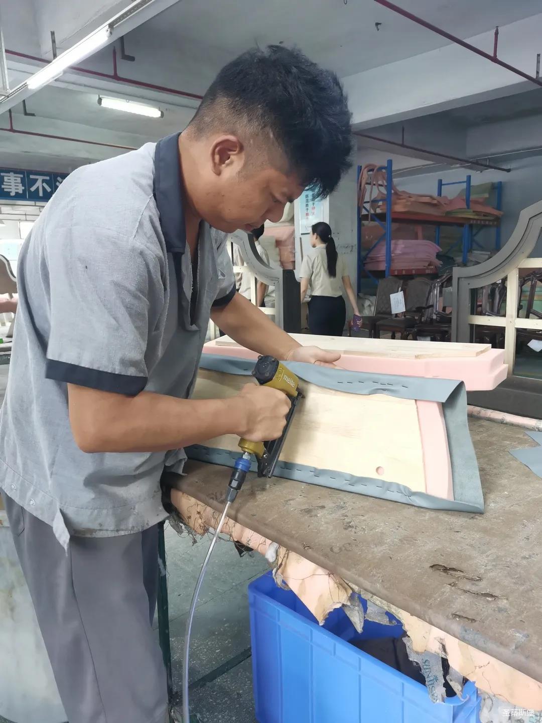 本屆技能競賽設(shè)置為工業(yè)組和商業(yè)組,共設(shè)競賽項(xiàng)目8項(xiàng),其中,工業(yè)組競賽包含了打滾邊、打銅釘、自身產(chǎn)品組裝、成品組裝、柜體噴底色、修色、板材開料等七大細(xì)項(xiàng)。商業(yè)組以組裝辦公臺(tái)、床頭柜為主。