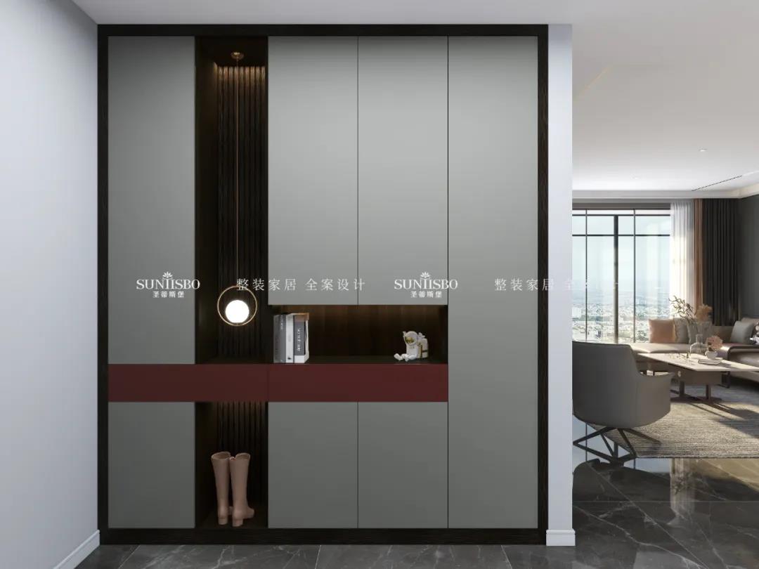 灰色平板門和煙熏色柜體做深淺搭配,搭配深灰鋁框門,整體簡單又大氣,再點綴一抹赤紅色,點亮了整個空間。