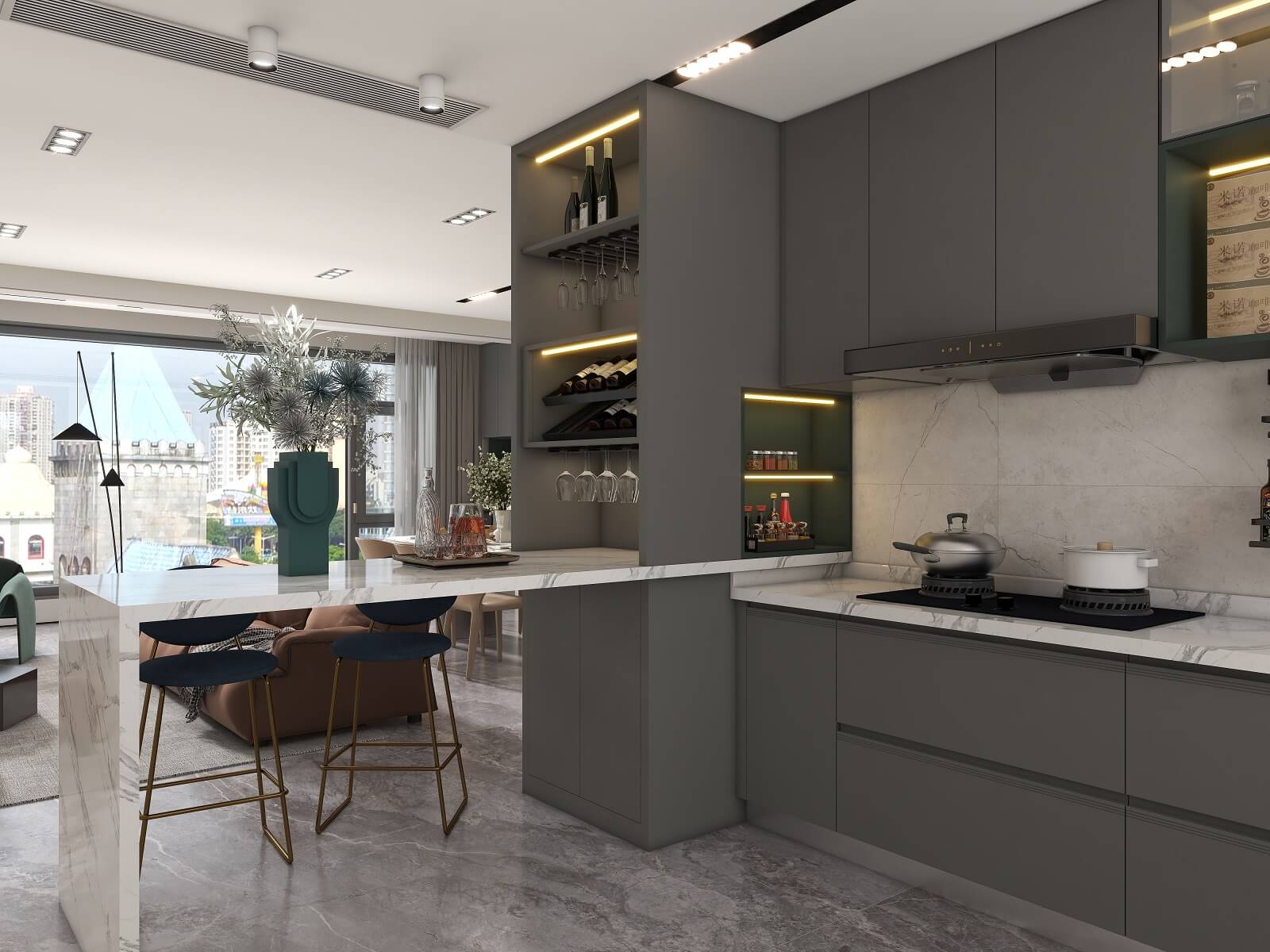 全面開放式格局,讓客餐廳之間相互聯(lián)動(dòng),毫無阻隔,在提升體驗(yàn)感的同時(shí),也增強(qiáng)了整體采光和通風(fēng)。