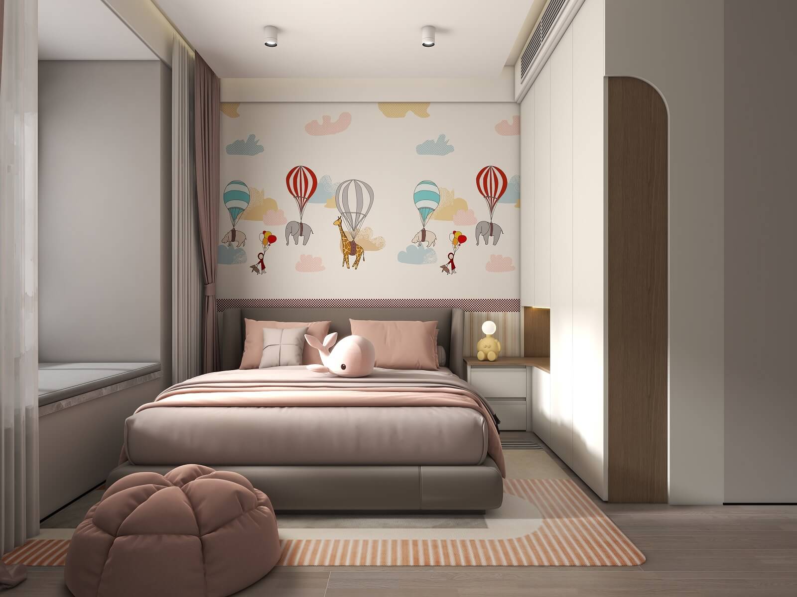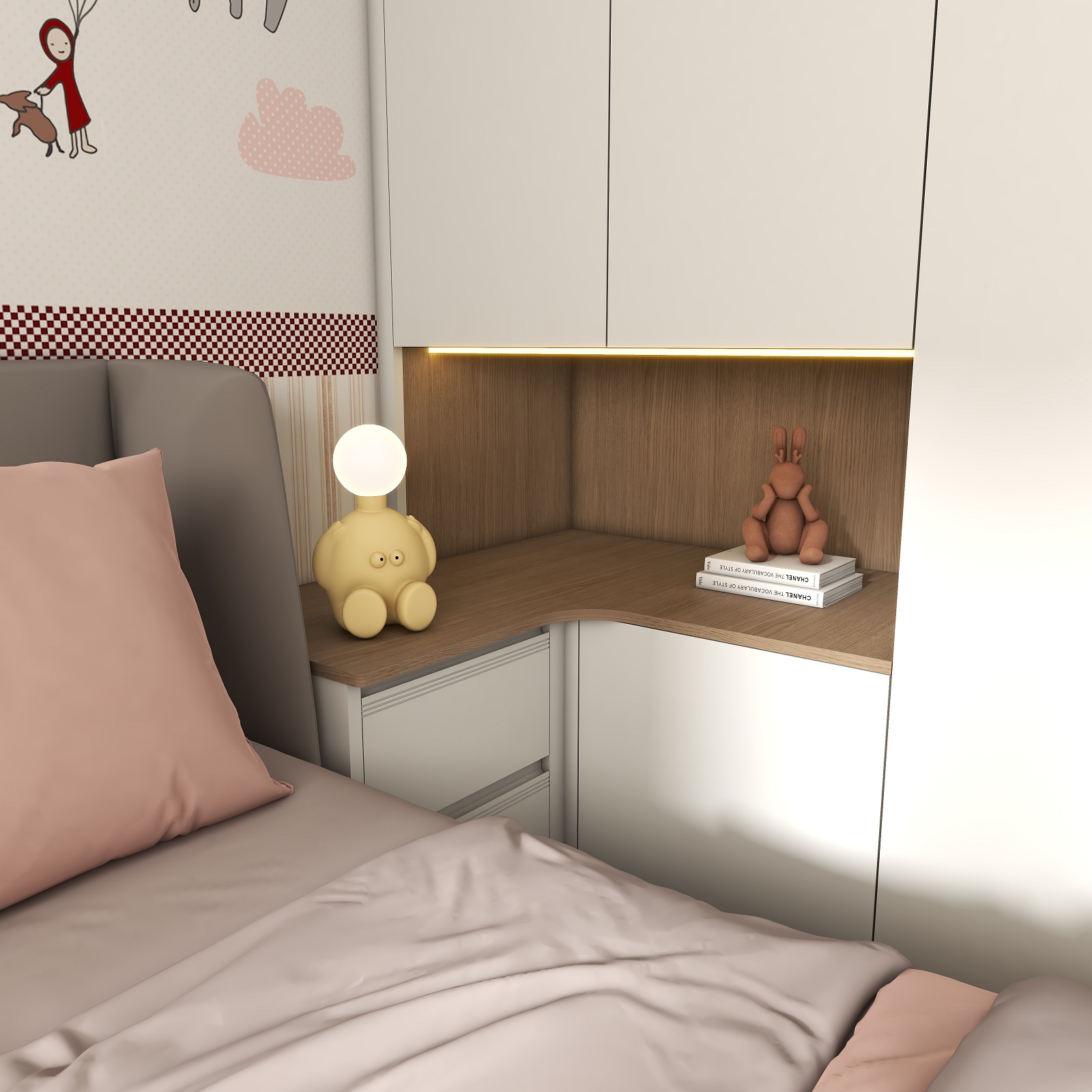 兒童房采用溫柔的奶白作為空間底色,整墻卡通貼畫搭配奶油白衣柜,在細(xì)節(jié)上用粉色裝飾作為跳色,無形中增加立體感和層次感,營(yíng)造出童真舒適的兒童夢(mèng)中情房。