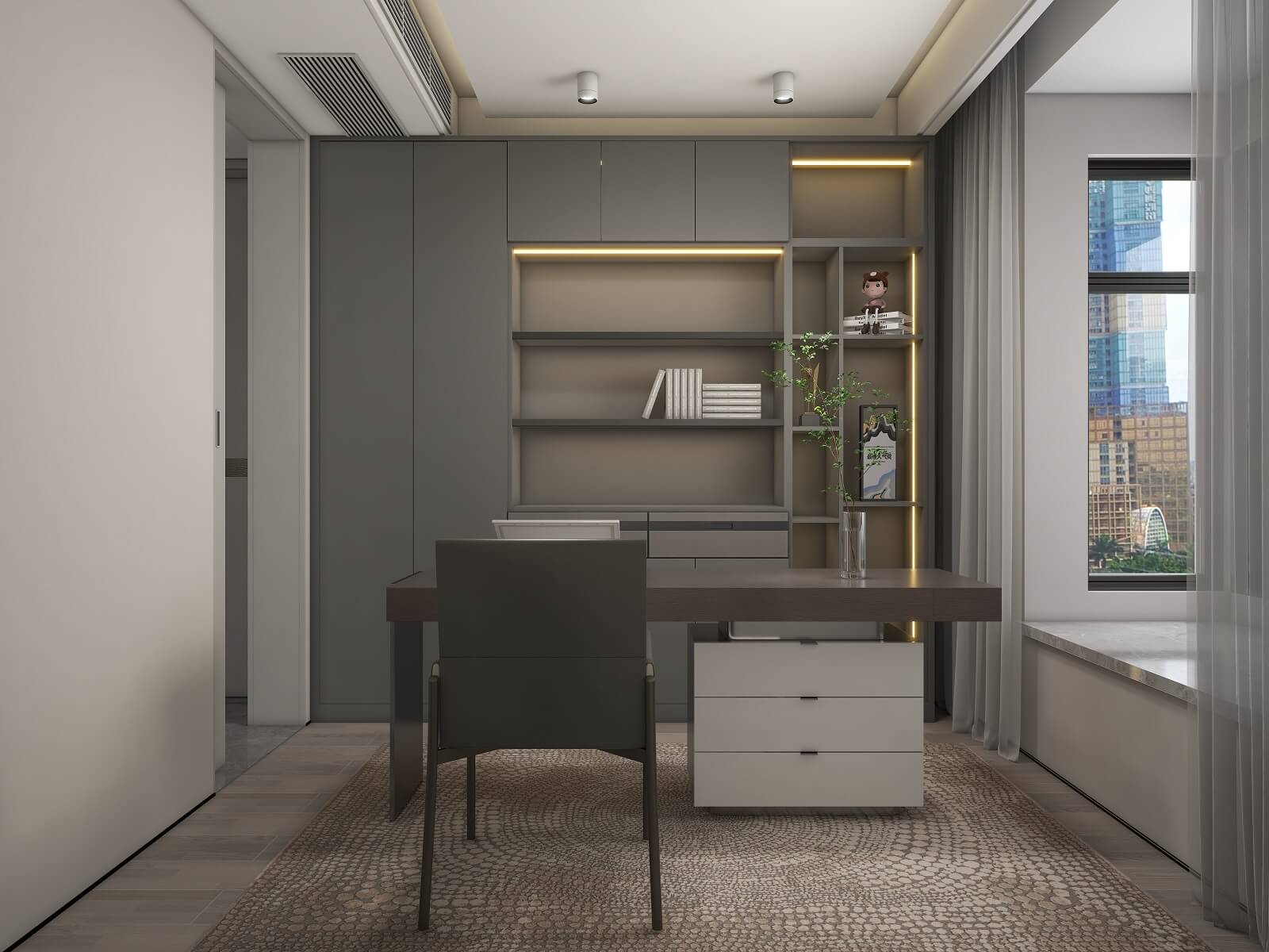 大面積運(yùn)用深灰色,格柵元素極具設(shè)計(jì)感,在層板燈的渲染下整個(gè)玄關(guān)輕奢有內(nèi)涵,給空間增添了幾分自然純粹的氣息,讓人身心放松。