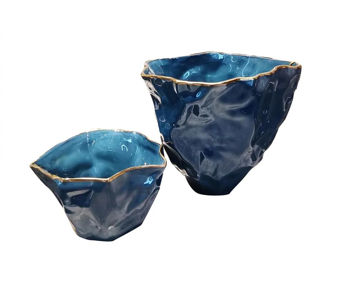 器口形狀各異,摒棄了傳統(tǒng)陶藝的方圓設(shè)計,引領(lǐng)中西結(jié)合陶藝的時尚特性,金邊鑲嵌,運用瓷器染色工藝,由深至淺洗染,以分明暗轉(zhuǎn)折。