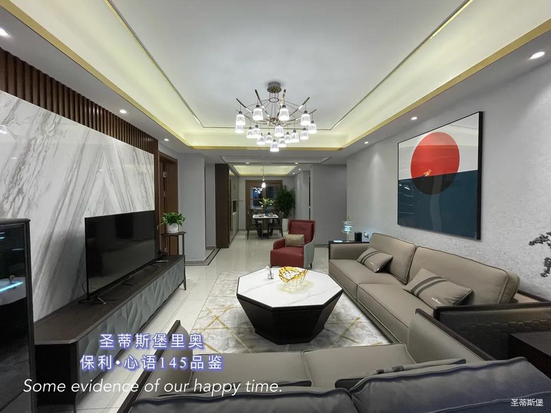 ▲客廳以灰色為主調(diào),電視背景墻采用拼接大理石搭配實(shí)木闌珊,與對(duì)立墻面形成撞色處理,既可以加深空間層次感,也提升了空間明亮度。一字型真皮沙發(fā)與實(shí)木電視柜中和了大空間的空曠,打造出一個(gè)談心敘話的和諧空間。