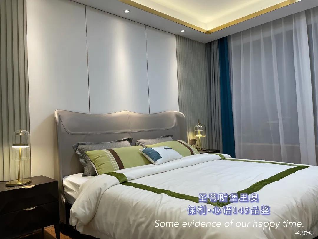 ▲次臥選用拼色,傳達(dá)出一種空間平衡美。這里的色彩相比于主臥更加平緩,視覺上也多了份輕巧。床屏與背景飾面組合出疏密有序的線條比例,詮釋著一個(gè)精工而不流于艷俗,純凈而不至于過渡簡約的精致臥房。